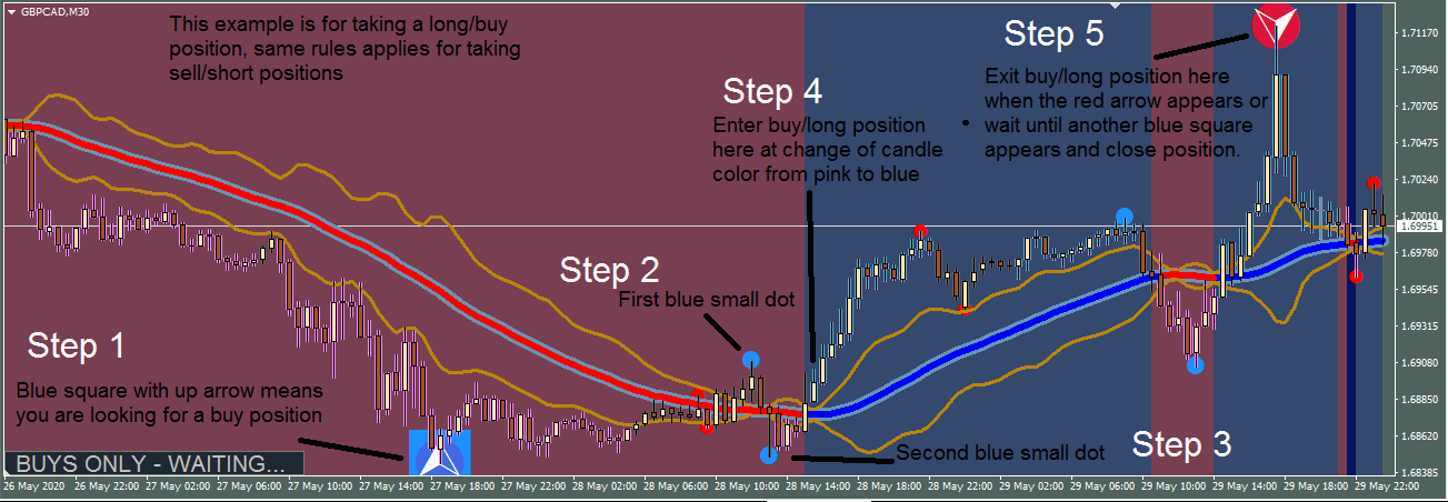 Just wait for a blue square to appear, then wait for a blue small dot to appear, then wait for another blue small dot to appear and open trade in direction of the blue square when candle changes color.
