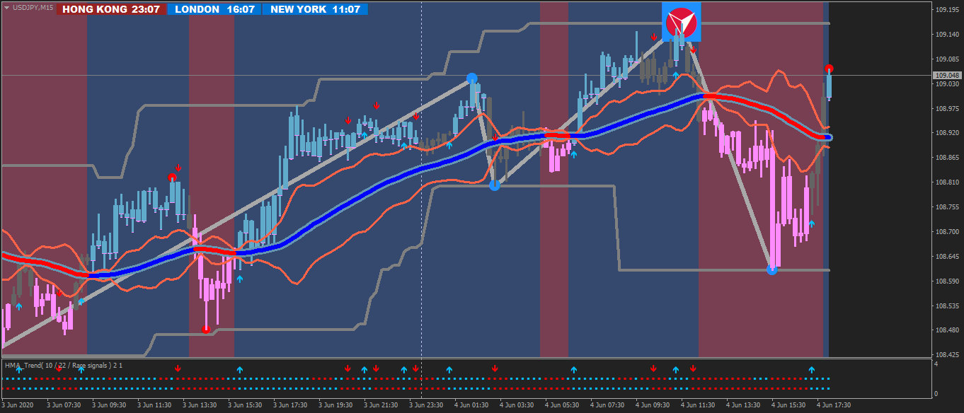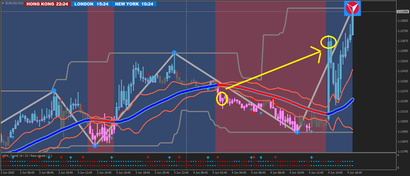 The best trades are at the cross of the Trend line if you are in a SELL on a Pink Candle then instead of a stop loss just bail if a Blue Candle appears. If you're in a BUY on a Blue Candle again bail if a Pink Candle appears.