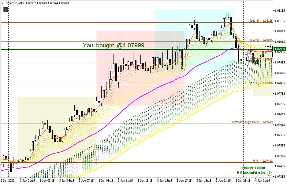 You bought @ 1.07999 which is near Fibo 150%. You should exit @ Fibo 161.8%