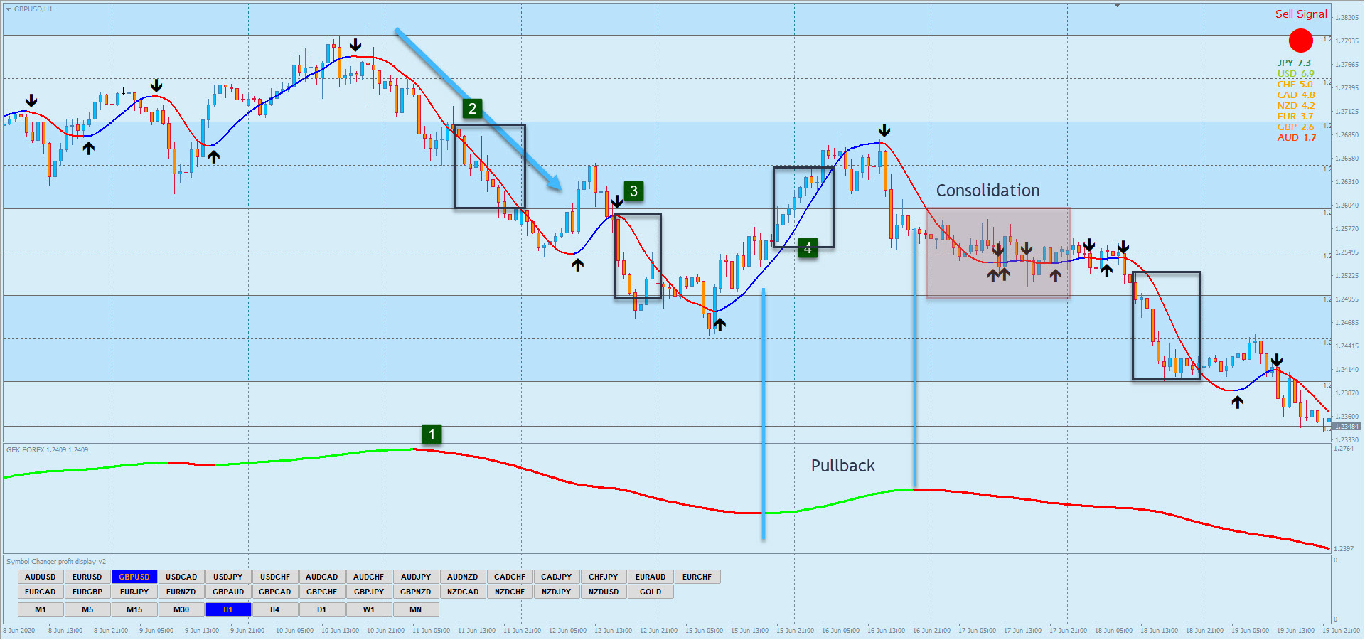 2. whenever the sharp signal down appear and at the same time GFX shows red ma and Sell signal on top right circle. See the currency meter on right if say for example GBPUSD GBP is weakest and USD is strongest we enter and target the nearest half or whole number as tp for scalp or swing.