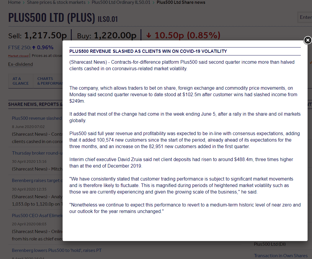 The former, as a business model, is relatively safe, they will weather most types of market upheaval. The latter is more at risk from unexpected events causing major turns in the market. Brokers are naturally shy about disclosing their business model so it was surprising recently when Plus 500 released a news statement explaining to share holders that the recent major profits drop was due to 'their clients getting it right' in their call on the recent Covid and Oil market turmoil.