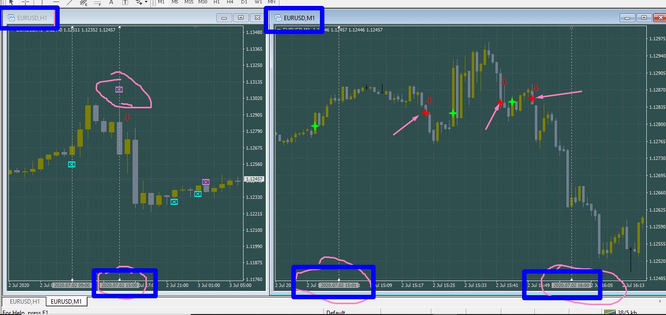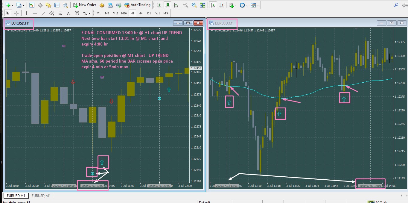 Trade open poisition @ M1 chart when pa bar crosses MA line open trade as per H1 chart indicator singal