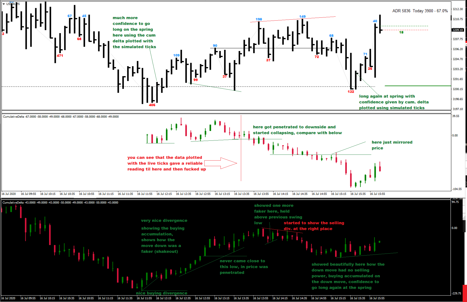 Here I show you how the cumulative delta plotted using simulated ticks is doing a better job than the data plotted with the incoming live ticks: