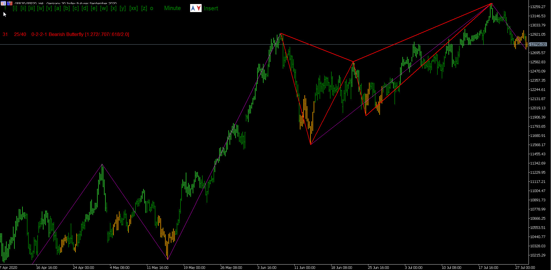 Well, it seems same butterfly is set also in europe. What is even more interesting is the fact there is allready at 30 min. data 5 waves down set. Next retracement up is potentially setting B wave, it could became as bat pattern. standard bat occures with B waves.