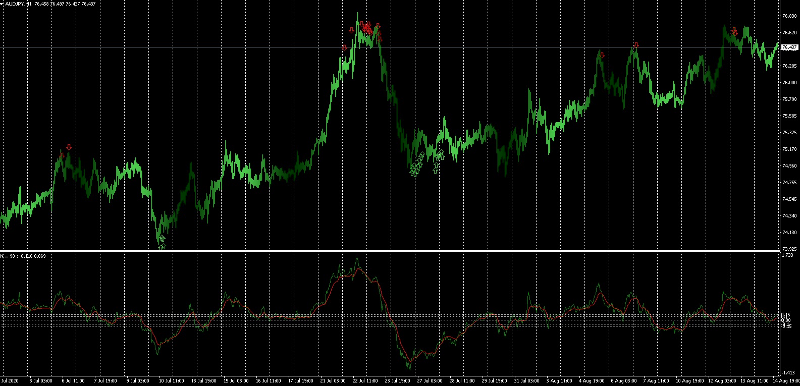 Arrows shows if indicator is over or under or equals the extreme level and if over or under ma on every bar while conditions are true.