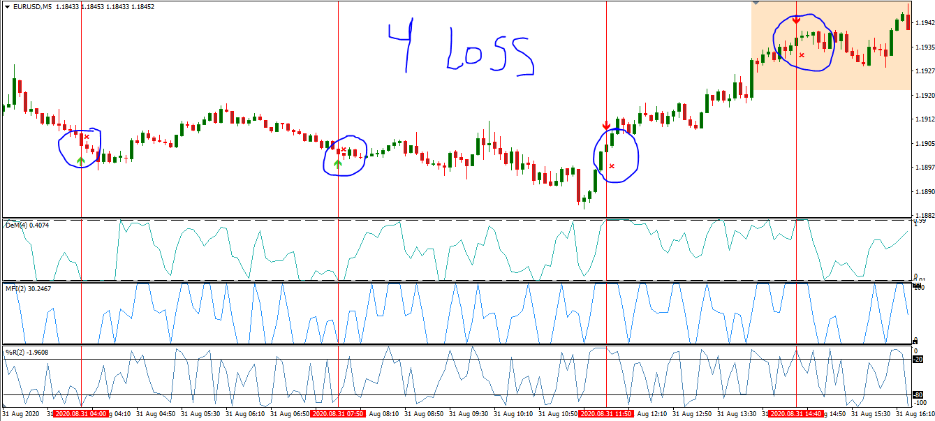 The idea is simple: When DeM cross 0.99 upward, MFI is equal or above 99 and W%R is equal or above -20 we go short on the next candle;