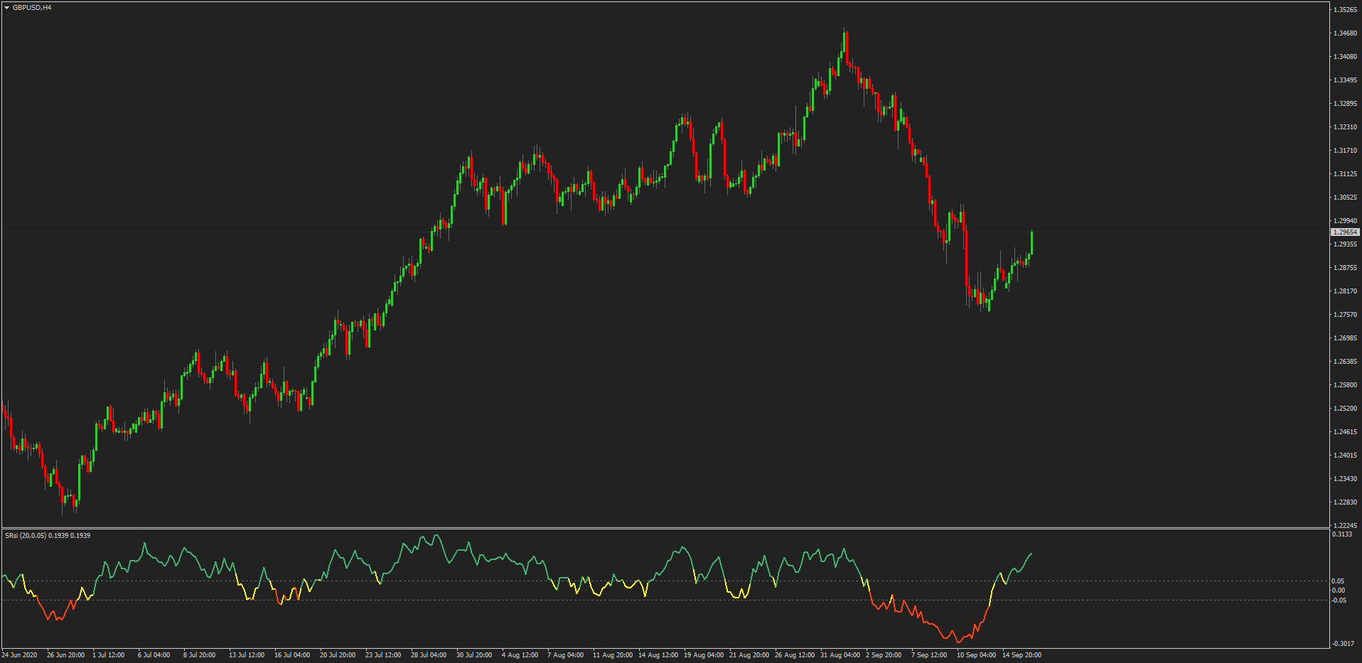 Green lines represent buy, red represents sell and yellow represents a balance between buy and sell signals on the SRSI.”