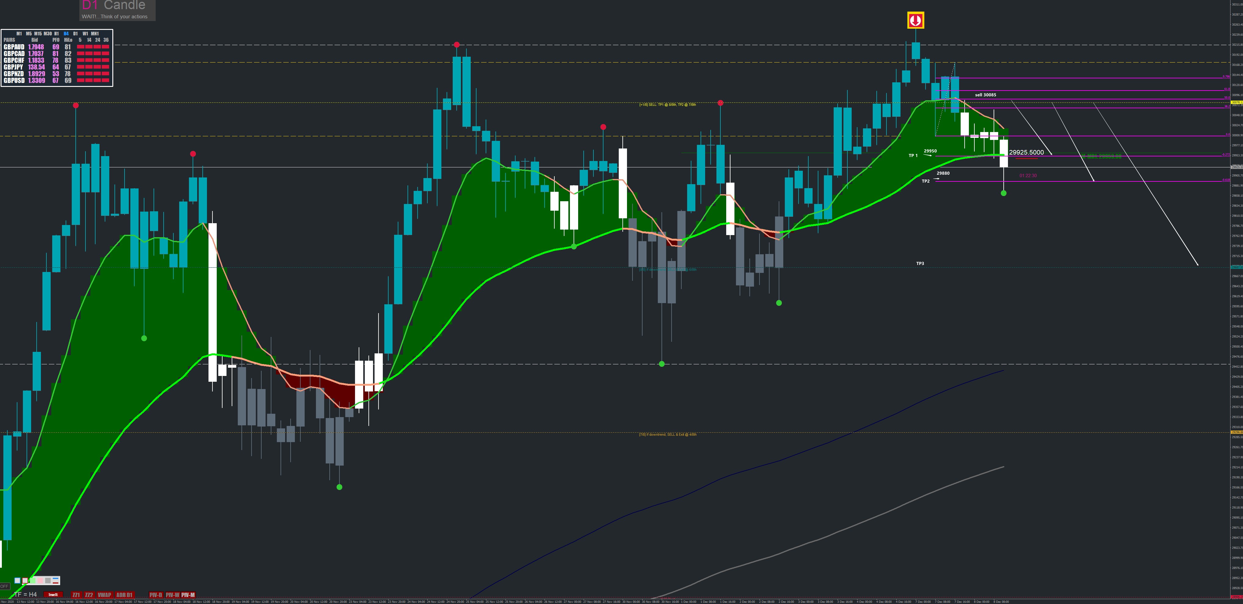 Tp1 Done 29950 but not trigger on my side (forgetting the order, it happens) Clear the short positions by playing the murray levels on M5, fractal resistance H1 H4; MM 144/200 on H1 + turning point on several TF. I don't insist when the R: R is very good. Several round trips at 90 points on average with an R: R of 13 times my risk (SL 7 points! 1% risk for 13% gain on average).