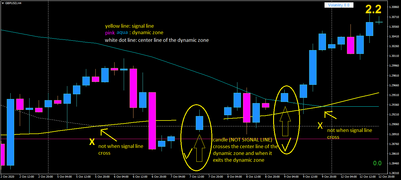 - arrows and alerts appears every time a CANDLE (not signal line) crosses the CENTER LINE of the dynamic zone and when it EXITS the dynamic zone