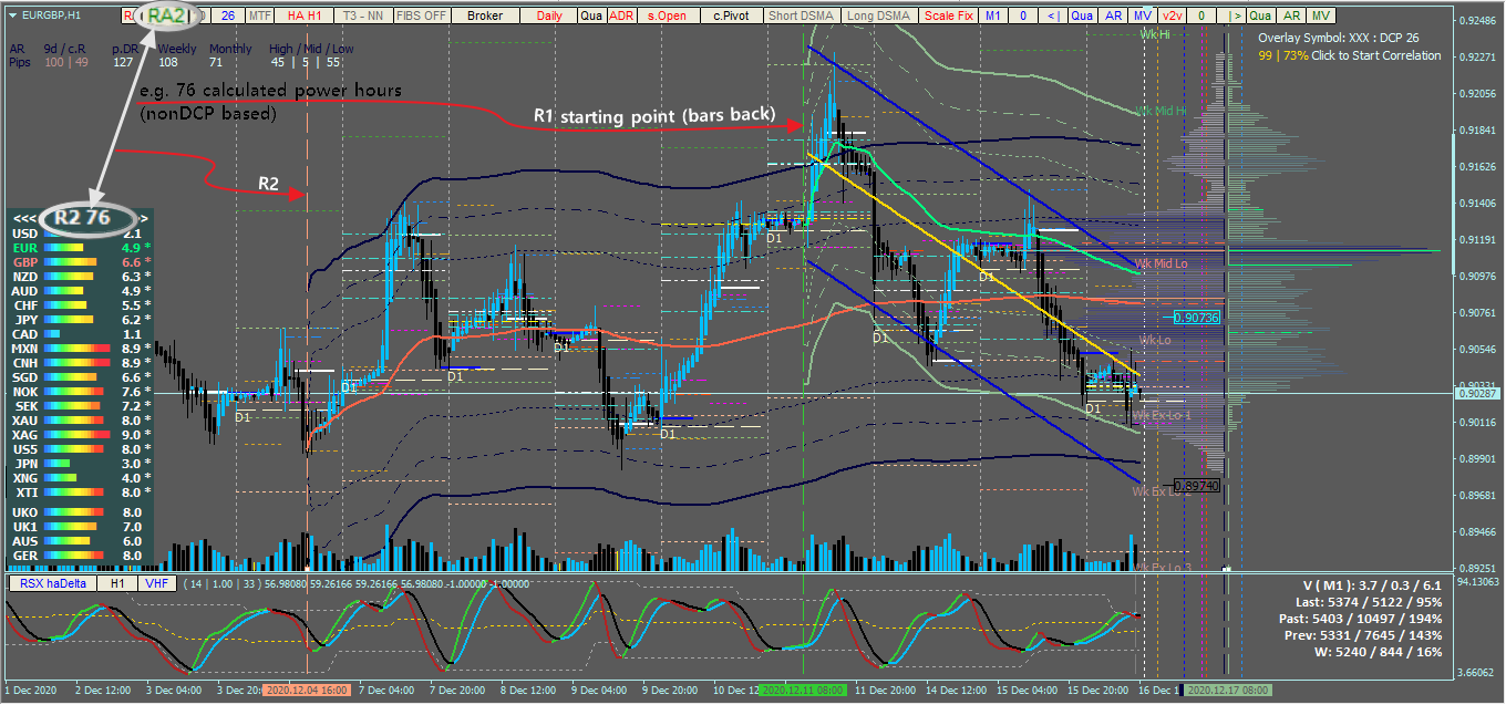 1 ) A unique strength indicator called a v2v Power is fueled by Dominant Cycle Period (DCP) to generate the number of bars (or Period) and calculate the number of power hours to use for gauging the strength of an instrument or symbol.