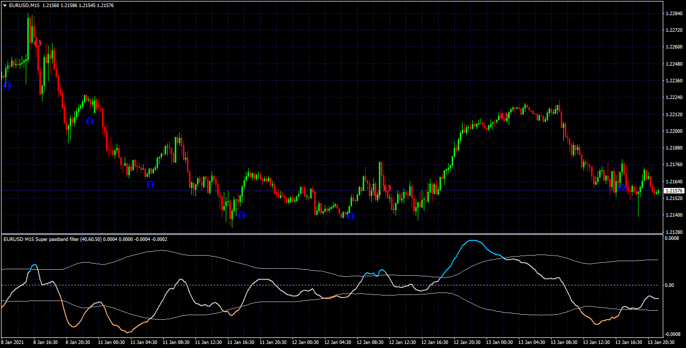 Arrows added, optimized the code somewhat, and changed out the mtf to use the lighter mtf.Ganesh wrote: Thu Jan 14, 2021 1:36 am Super Passband Filter.mq4Hi,mrtools, can you add on-chart arrow and vertical line to this attached indicator when line exit from the upper and lower band [ Line exit from overbought and oversold zone]