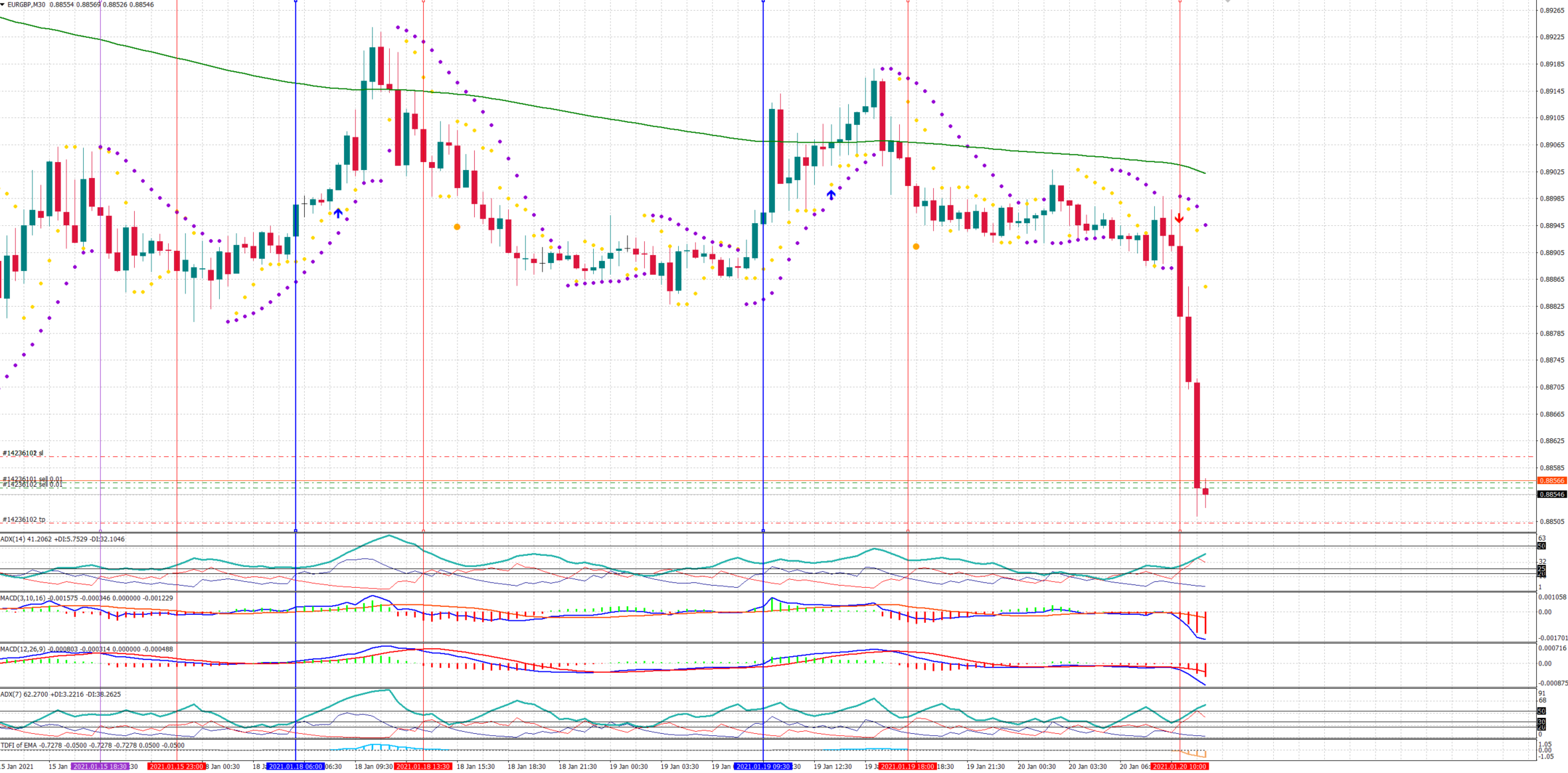 Purple vertical line - I might have traded only because ADX(7) -DI line went to 20.