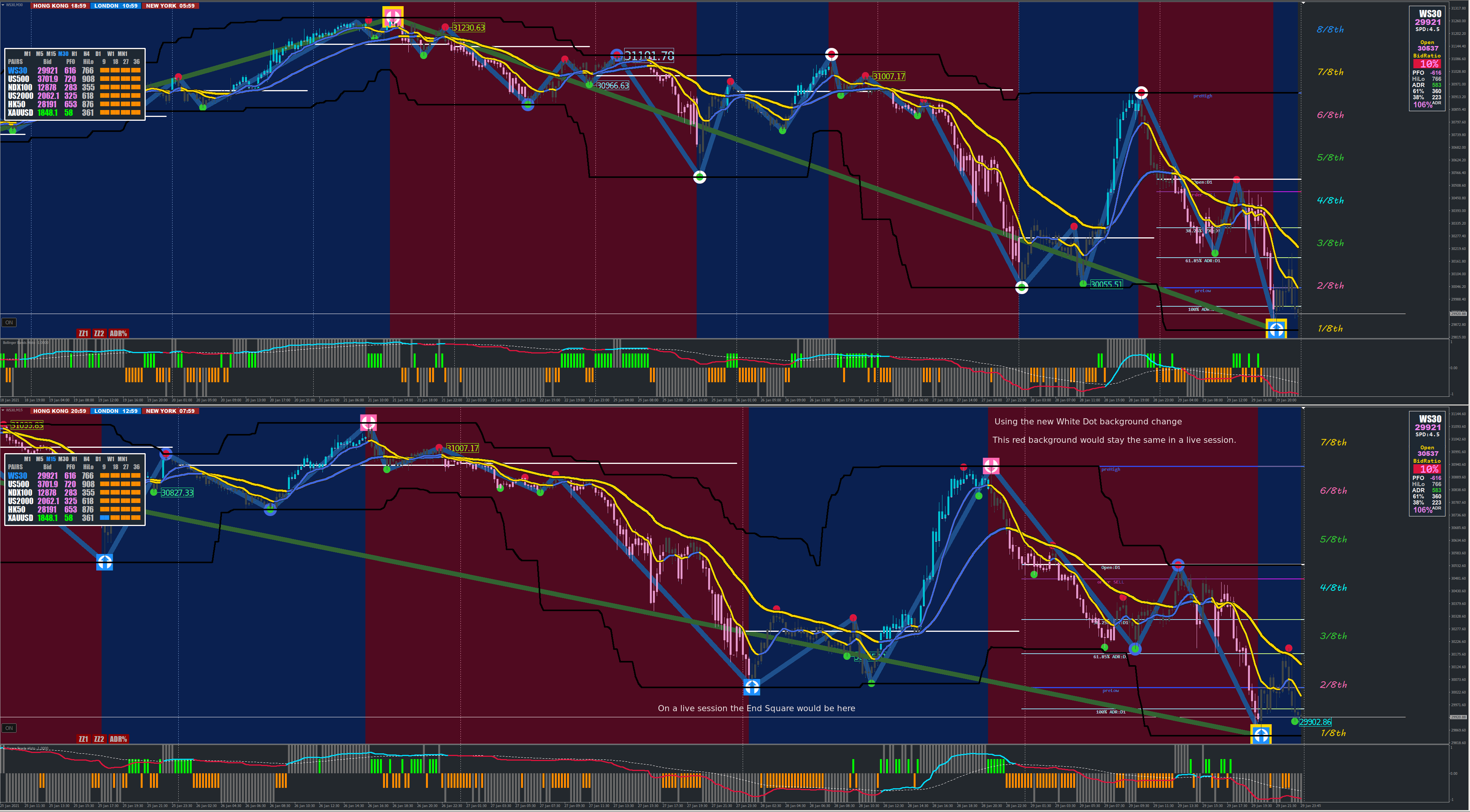 Try this out... 5m,15m, and 30m TF backgrounds are in sync with changes on Semafors greater than or equal to the White Dot.