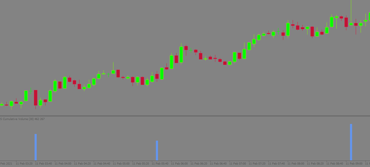 is it posible to make a signal out of this indicator, is a cumulative volumen that somebody shared in this page, i´ve realise that if the blue bar appears is likely the price will go to the other way (if the bar appears on a green candle the next candle will be red and vice versa) but it needs a signal, can somebody please make it?