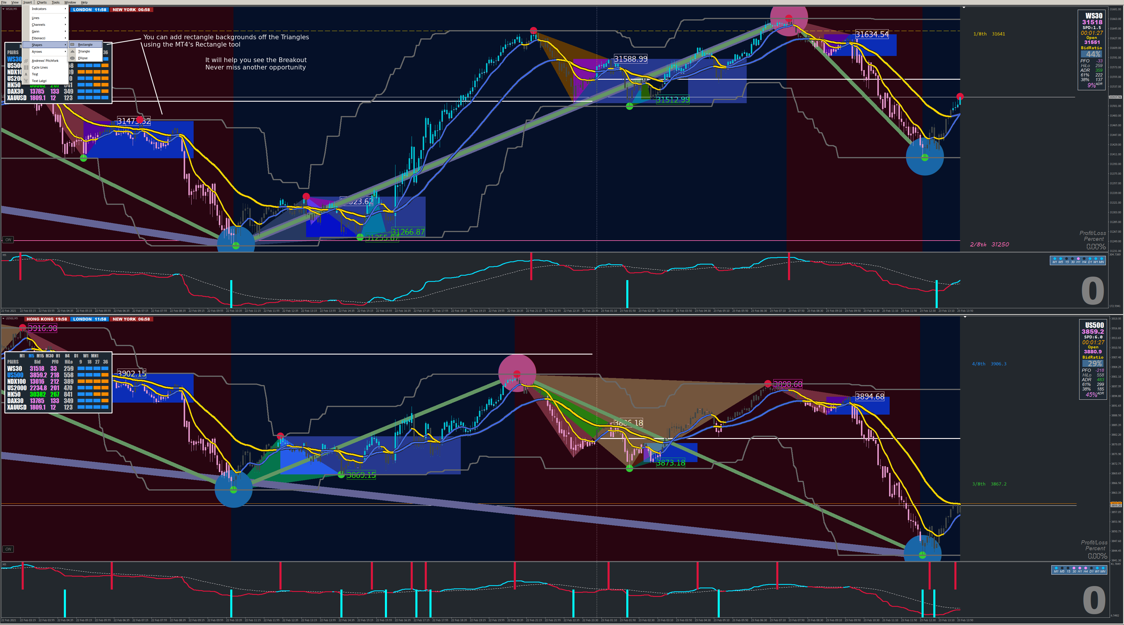 Here you can use the shape tool within MT4 to draw rectangles in the background where the Triangles will breakout - I chose color DarkBlue to highlight the Rectangle. Make every day a trading day (well, during the week, party like mad at the weekend:-)