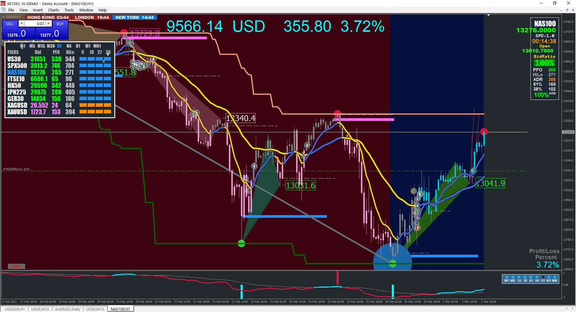 By the time I start my trading most of you have already gained your great pips. I started this trade around 7:00AM my time. It had already had a good run up on the lower TFs. I took it on the 15M just after it had crossed the MAs. Friday I took several smaller trades and was up about 2.5%. You can see those trades on the chart. Today I tried something else. I already had a red dot. So I went to the one hour TF and measured the increases( each move up until there was a pullback). I measured these with the diagonal line toll. I placed them on the chart from the low of this last leg up( the one I was trading). This tells me how far each leg up went before it turned. You can see the red lines near the end of my trade. I got out of the trade when the price reached the lower average of those lines. Got out just before noon my time and had a 3.5% gain.