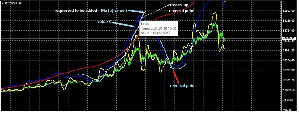 the indicator has drawn 4 buffers (line), I am looking for the signal line for each buffer (moving average line of each buffer) to find the reversal point (when the signal line crosses the related buffer up or down.