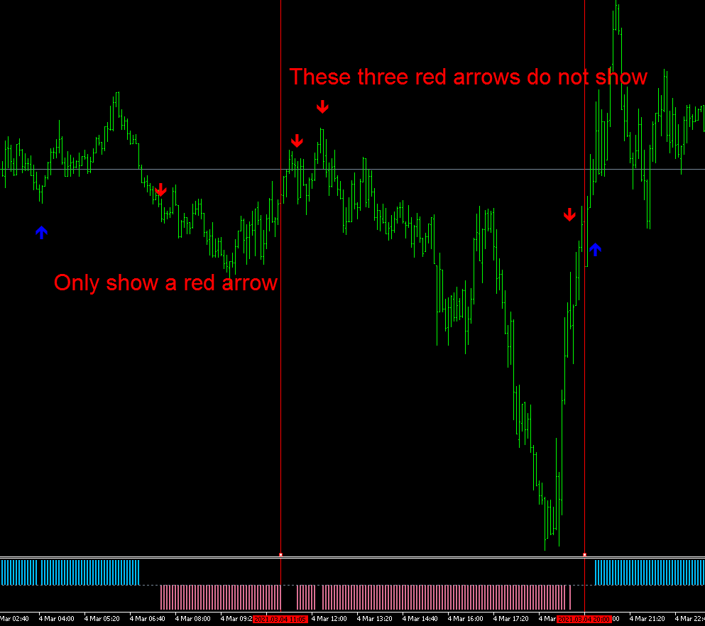 Not bad! If only one arrow is displayed in an upward or downward "trend", the arrow in the opposite direction will not be displayed until the opposite "trend" appears, even better! That is, the up arrow is displayed, and then the down arrow is displayed. When the market does not have an upward or downward direction, no arrows are displayed.