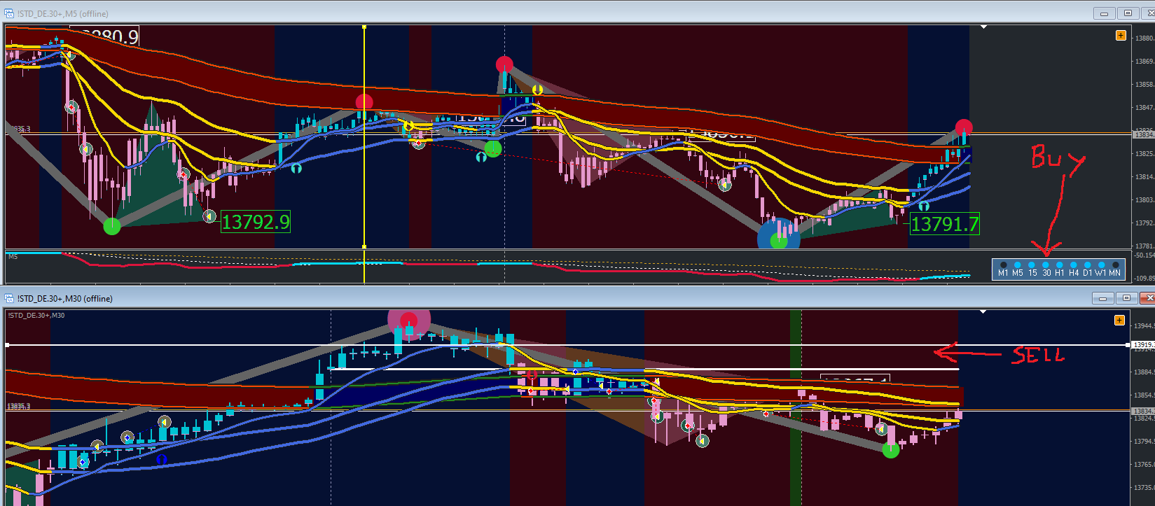 If you trade in TF 5M have to see the trend in TF 30M, but you look the chart or the Trend box of the chart.