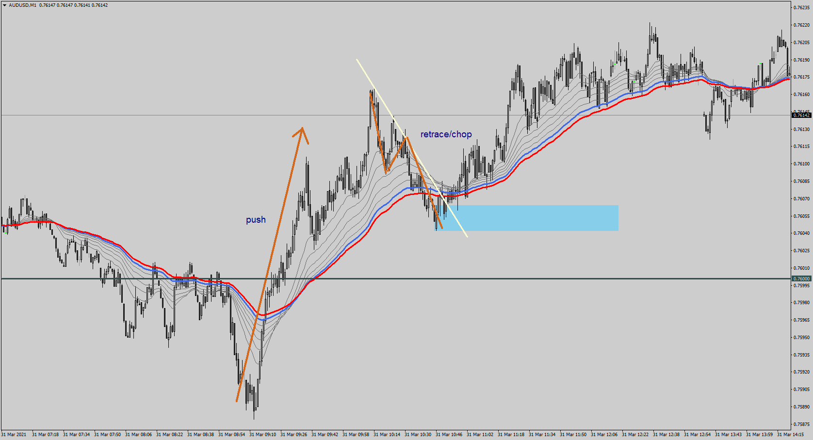 it is all about pullbacks here, so we draw a trendline AFTER a decent push followed by a retrace into the bands. Example same AUDUSD but 1M bounce long on the 0.76 level