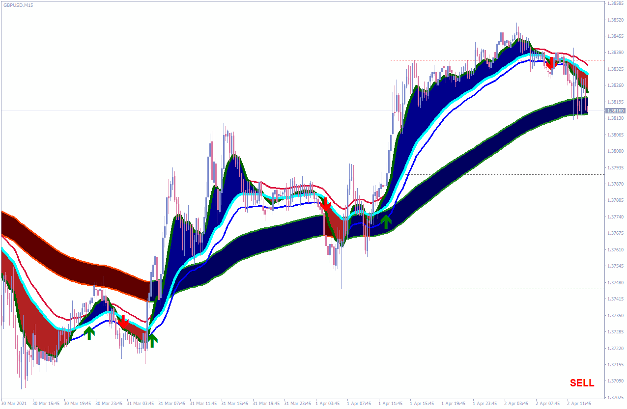 9/36 EMA median Price with high low channel filled + arrow + Previous day high low median