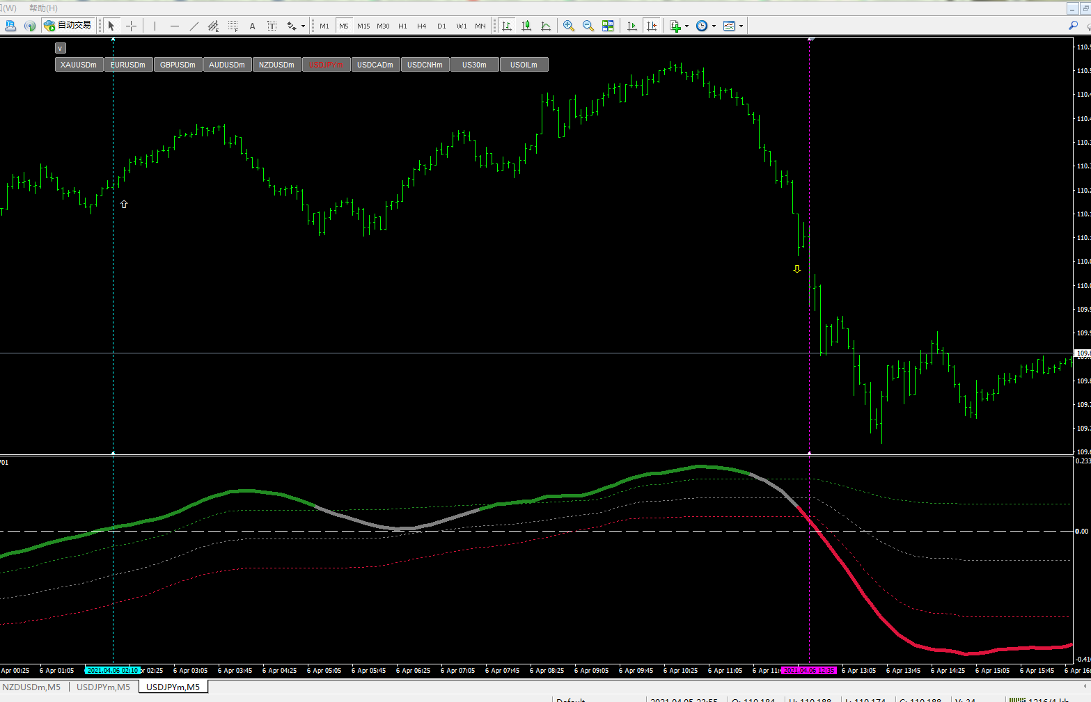 Trouble with the teacher again: when the main trend line (green + red + gray thick line) crosses the horizontal position (that is, the 0 line), draw a vertical line, or arrow, and alerts on the main chart. Thanks a lot!