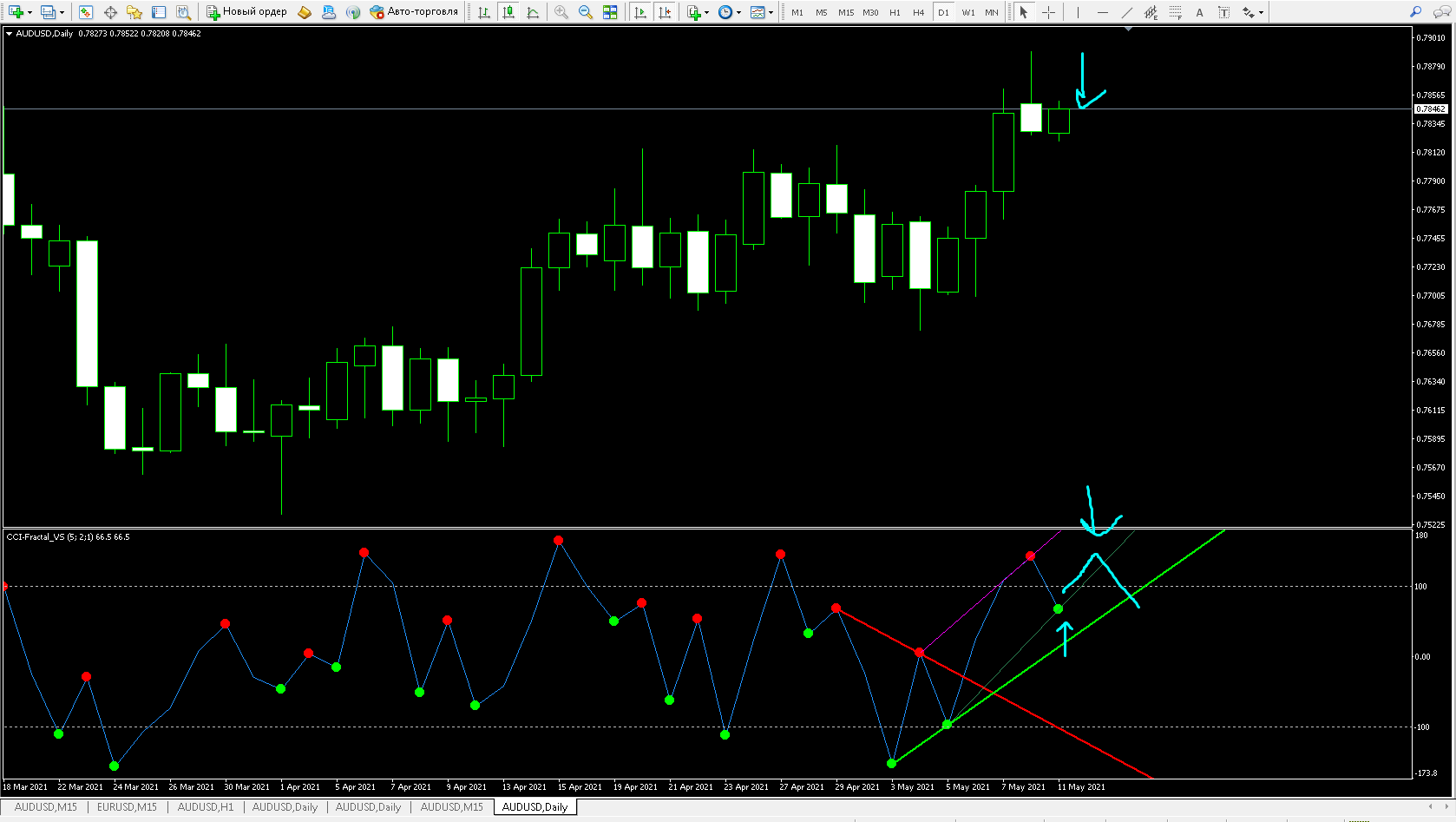 It is necessary to attach adjustable fractals to the standard CCI with the open price type