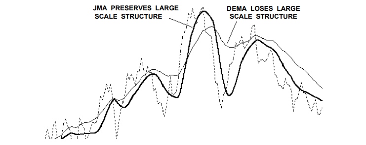 The financial investor tries to apply just enough smoothness to filter out noise without removing important structure in price activity. For example, in the chart below, the popular Double Exponential Moving Average (DEMA) is just as smooth as JMA yet DEMA fails to track large scale structure ( the big cycles). On the other hand, JMA follows the cyclic action very well.
