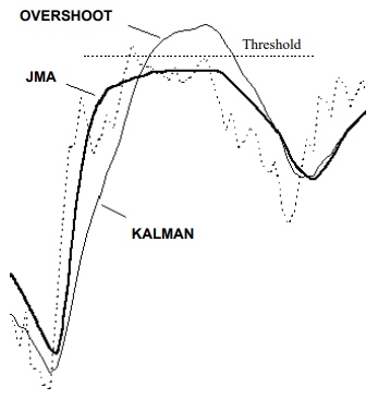 For example, in the chart to the right we see the famous Kalman filter overshoot price data, creating a false price level that the market never really achieved. DEMA filters also tend to overshoot. The overshoot crosses the shown threshold and triggers a false alarm. In contrast, JMA did not overshoot and thus avoided a false alarm with the user's set threshold.