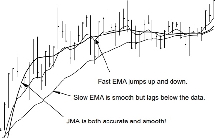 In the chart to the right, EMA and JMA filters are run across closing prices. Note how much the fast EMA alternates upward and downward while JMA glides smoothly through the data.