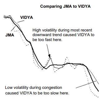 In the chart to the right, JMA is the thick solid line and VIDYA is the thin solid line. Both perform approx-imately the same for the first 1/3 of the series. But due to the high volatility during this downward trend, VIDYA becomes hyperactive and fast tracks the choppy waves during the congestion phase of this time series. Smoothing is lost. In contrast, JMA cuts right through with a smooth horizontal line. In addition, the decrease in signal volatility soon causes VIDYA to slow down, too much in fact, as it lags behind JMA during the next downward price trend.