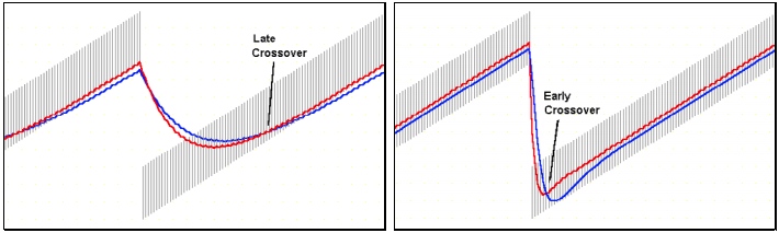 The two charts below simulate a rising trend of equal-sized price bars, punctuated by a downward gap. Trend following systems using signals from the crossover of classical moving averages would fail miserably because the crossovers would arrive too late to take full advantage of the trend (LEFT CHART). In contrast, JMA creates crossover signals almost immediately, riding a good portion of the trend for greater profit (RIGHT CHART).