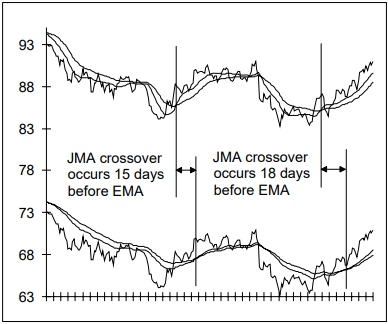 In the chart to the right, EMA and JMA filters are run across closing prices. Note how much the fast EMA alternates upward and downward while JMA glides smoothly through the data.