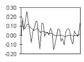 In the chart to the right, JMA is the thick solid line and VIDYA is the thin solid line. Both perform approx-imately the same for the first 1/3 of the series. But due to the high volatility during this downward trend, VIDYA becomes hyperactive and fast tracks the choppy waves during the congestion phase of this time series. Smoothing is lost. In contrast, JMA cuts right through with a smooth horizontal line. In addition, the decrease in signal volatility soon causes VIDYA to slow down, too much in fact, as it lags behind JMA during the next downward price trend.