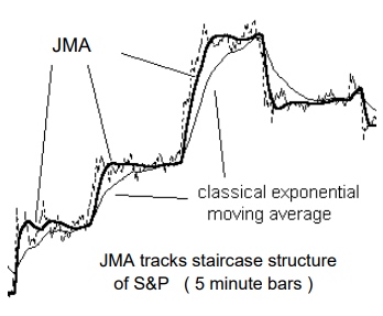 JMA can also track price gaps produced by INTRA-DAY data. The chart on the right shows how JMA jumps to the next day’s price levels while the classical exponential moving average lags behind.