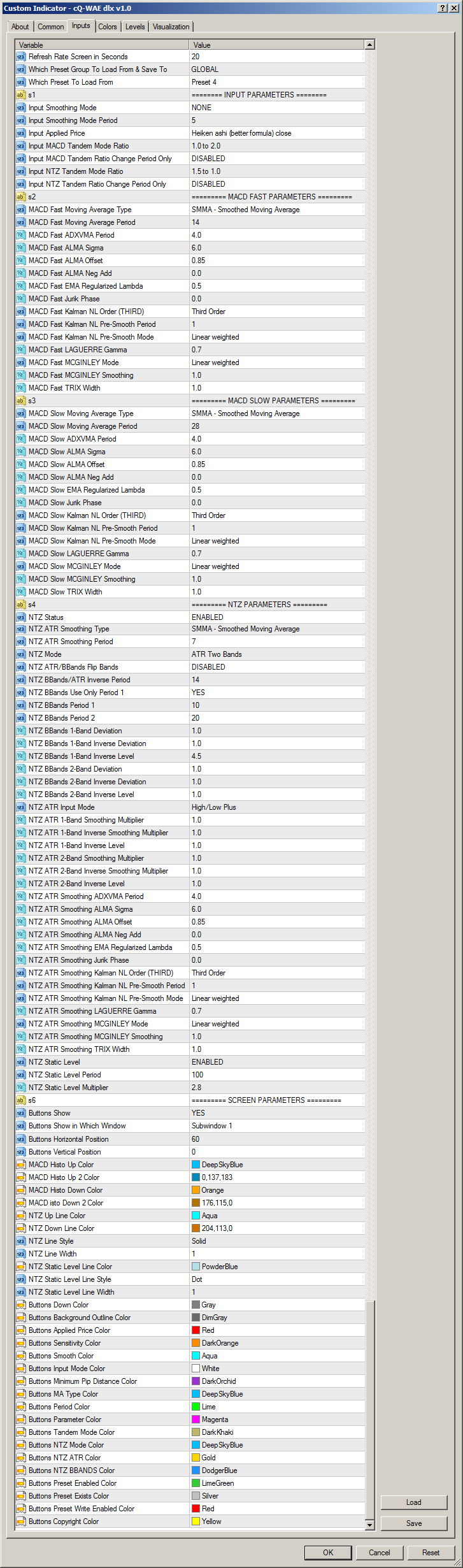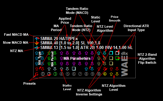 Thought I'd share a very special version of the WAE indicator that I've recently added to the trading arsenal. This version is made by a coder named "CQindicators". His newer iteration, based on the already popular "WA Explosion by Waddah Attar" has now received some major upgrades; making it more effective, as well as adaptable due to its customization options. This new version called "WAE Deluxe" - now has on chart buttons that allow instant parameter changes of its 30+ MA type's, smoothing method's, applied price options and directional ATR/NTZ functions. This one will keep you really busy. The picture's below will give you a better idea of all it's functionalities...