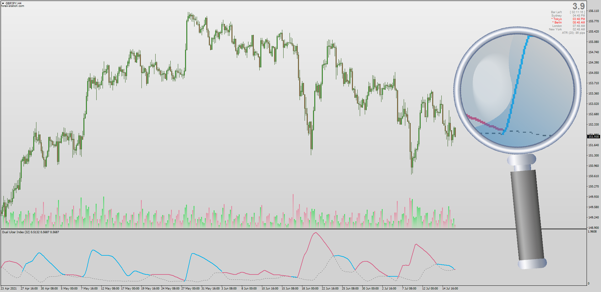 Mladen's Dual Ulcer Index is a technical trader's best kept secret. Originally intended for calculating depth & drawdowns from price's "highs", if we invert this code it becomes an incredibly accurate trend trading tool. Updated by Mrtools with Alerts: viewtopic.php?p=1295439175#p1295439175