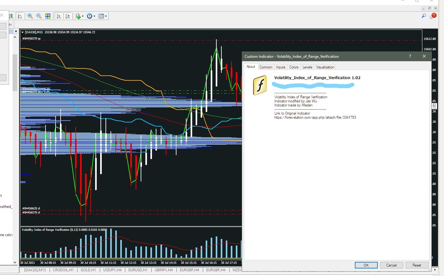 Hi I'm trying to find the original indicator in the screen shot below, called Volatility of Range Index made by Mladen but haven't been able to find it here. Do you know where it or similar Volatility of Index indicators can be found on the board here? The link in the indicator doesn't go to the right place. Many thanks.