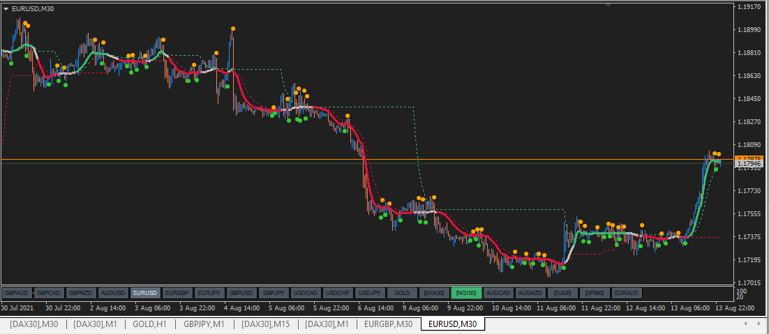 In picture small colored dots is from non levels DSMA both period 50, price close.