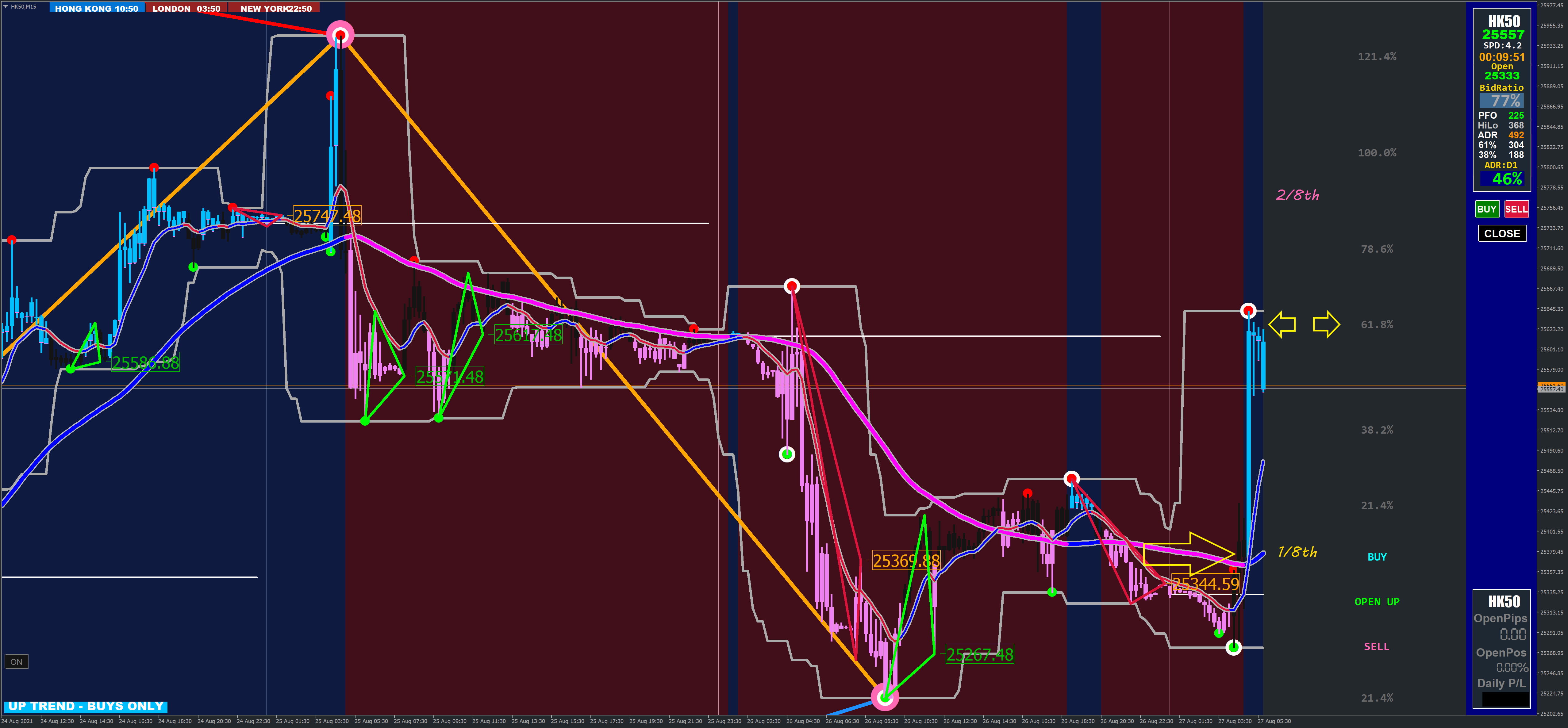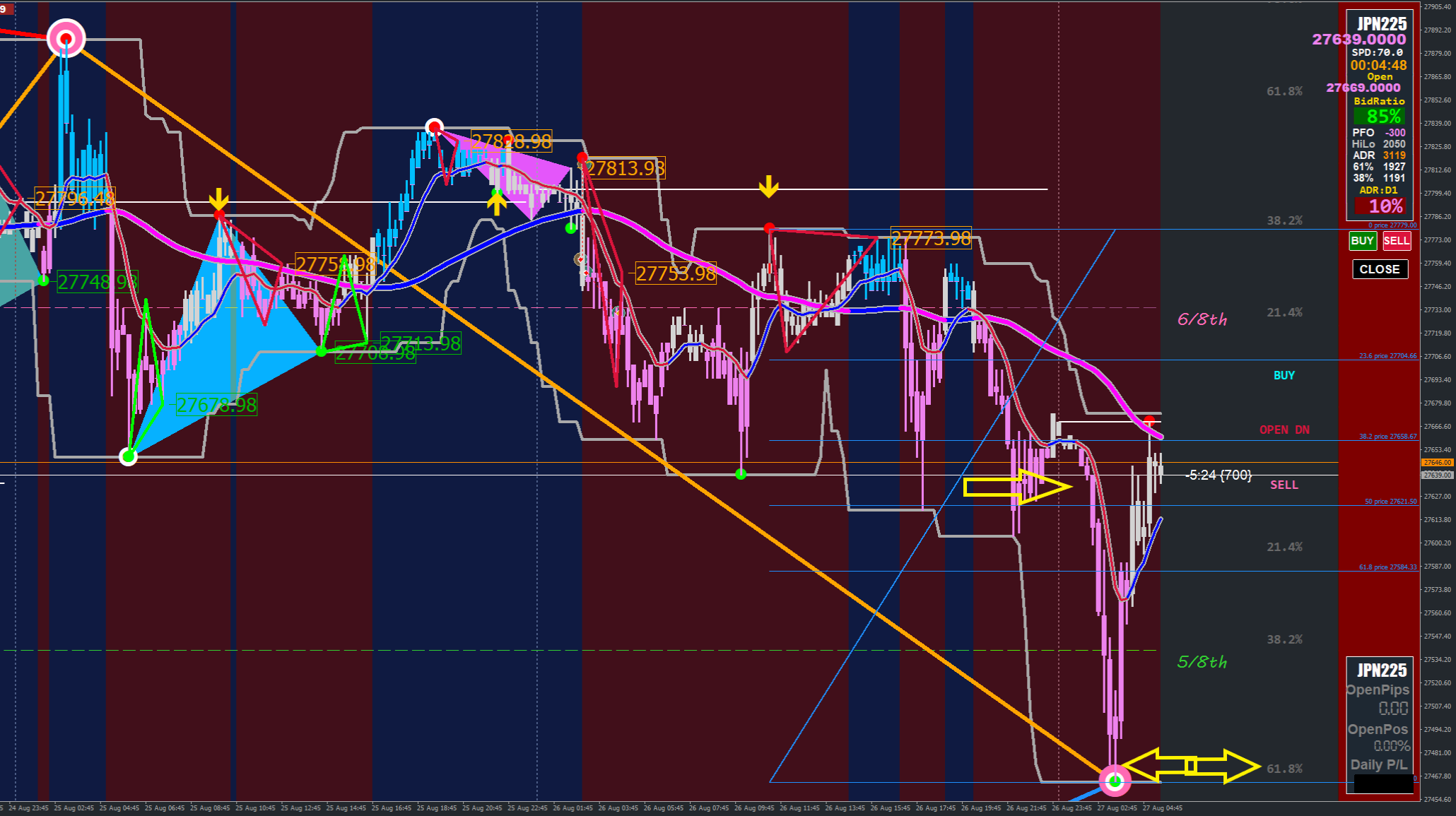 Two really good trades on HK50 and JPN225 this morning. I entered JPN225 with the entry rule I use, price is under slow MA reached SELL level in the column to the right of the chart. TP at 61.8. Same on HK50 but this time a buy and coming off the hourly second dot (dot with white ring). Same TP at 61.8, quick, easy and stress-free.
