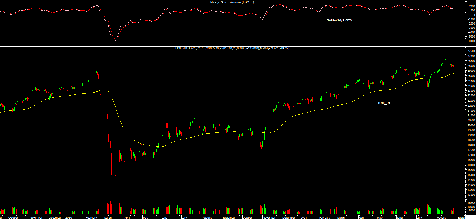 Thanks a good step forward, the cmo 2 I can not get it to work, I would be curious to see it but the cmo_ma is very close to what I had in mind, in practice from the cmo_ma I would remove the Red Vidya (even if it can be hidden), and I would use it as a separate indicator, making the difference with the close, essentially closing the price - Vidya cmo and leave the cmo_ma on the chart, something like this:
