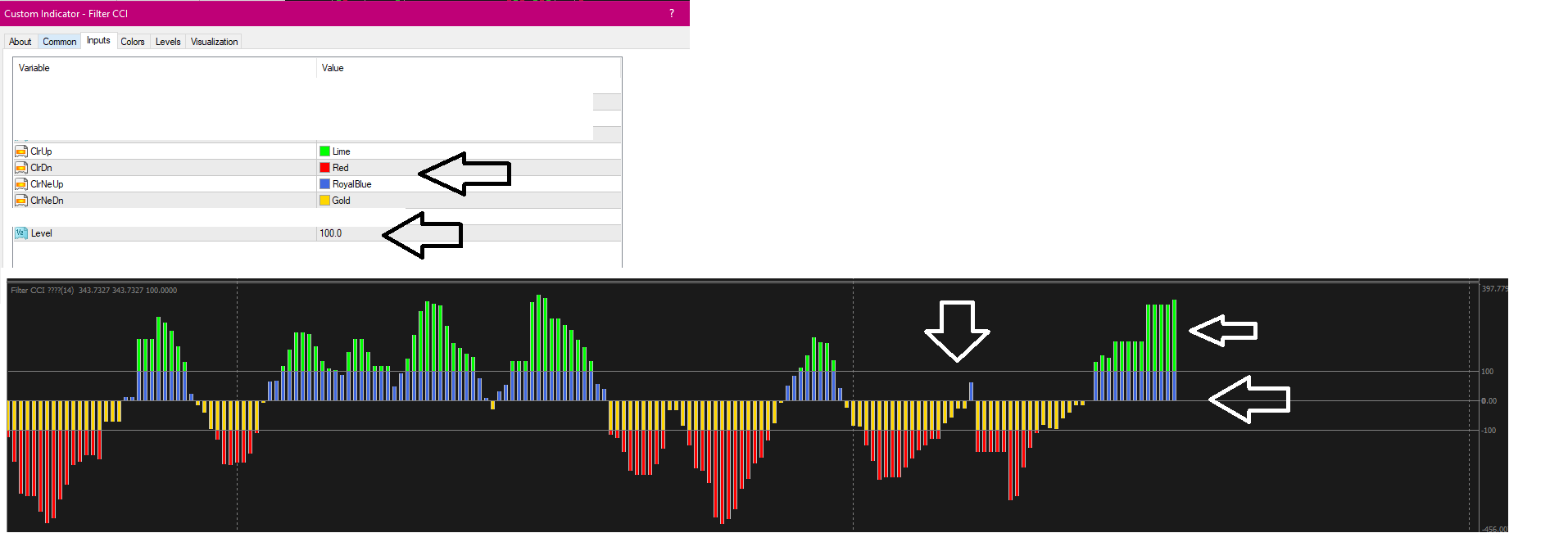Is it possible to add these 4 colour histo bar logic based on Input level ( 100 or ___ ) from Filter CCI Indi