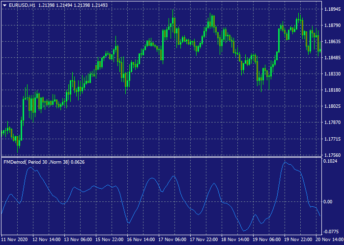 In a Technical Analysis of Stocks and Commodities article, May 2021, John Ehlers proposes a FM Demodulation Indicator that extracts the FM component of price movement. The AM portion of price movement represents volatility and the FM component contains market timing information. This indicator is an MQL4 implementation of the Easy Language indicator described by Ehlers in the TASC article.