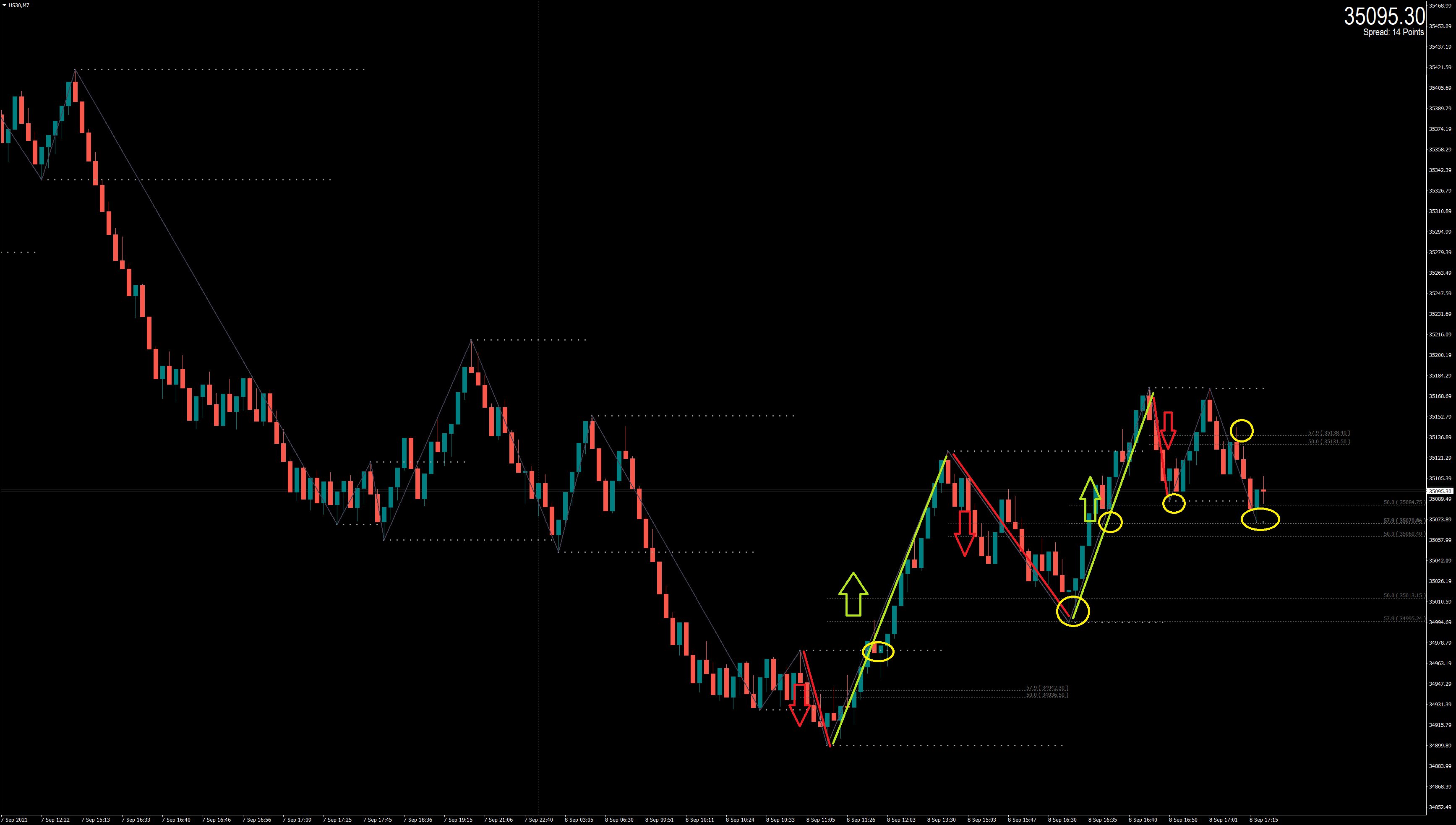 The next step requires some screen time but after a while you are doing it mentally. You are going to see the high and lows of the ZigZag movements and you are going to draw the fibo tool from the high to the low in case of down movement and from low to the high in case of up movement.