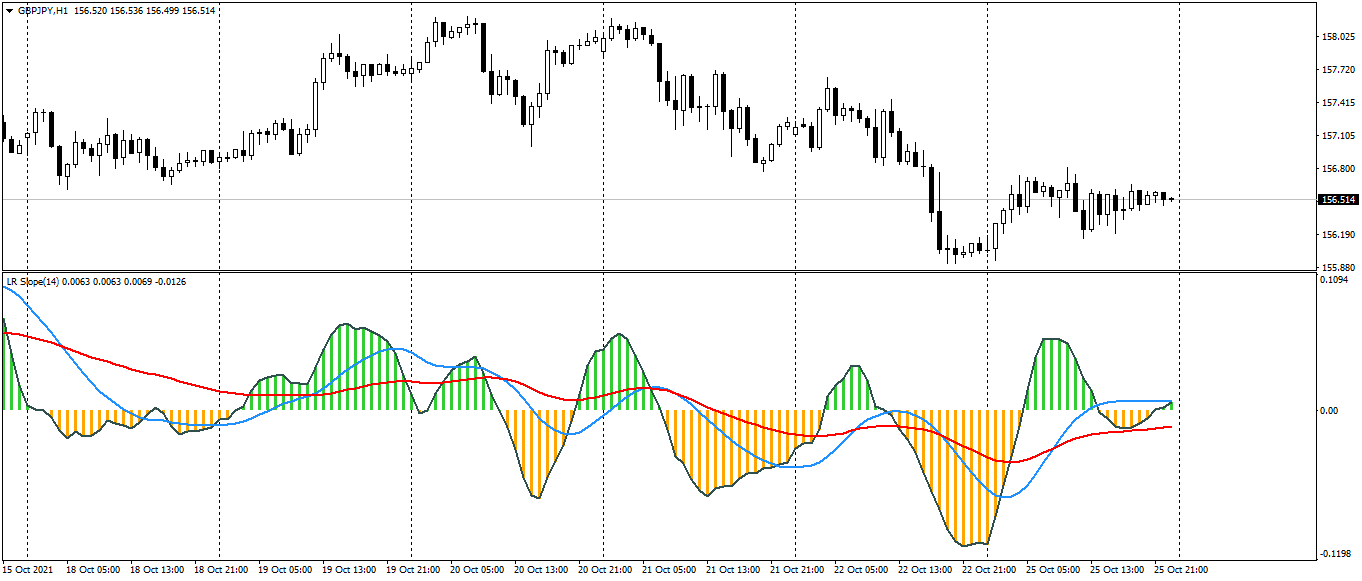 Visibility of linear regression line, channel and projection can be chosen with parameters (for projections just set the projection length to 0 to turn it off). By default a close-close is used for channel (that is the way how metatrader built in liner regression channel works) but you can use a high-low channel too. Coloring of the linear regression line is by default using linear regression line slope but you can choose to color according to linear regression value slope (slope of the main indicator) or you can turn it off altogether