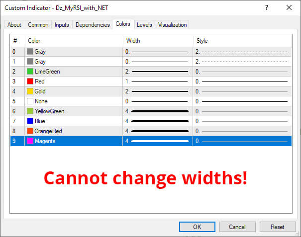 Again V2, really appreciate the modification you've made to Mladen's indicator but we still can't change many colors or widths. Is there a reason for this?nathanvbasko wrote: Fri Nov 19, 2021 12:42 am The final release for the stand-alone (well, sort of) dynamic MyRSI with NET