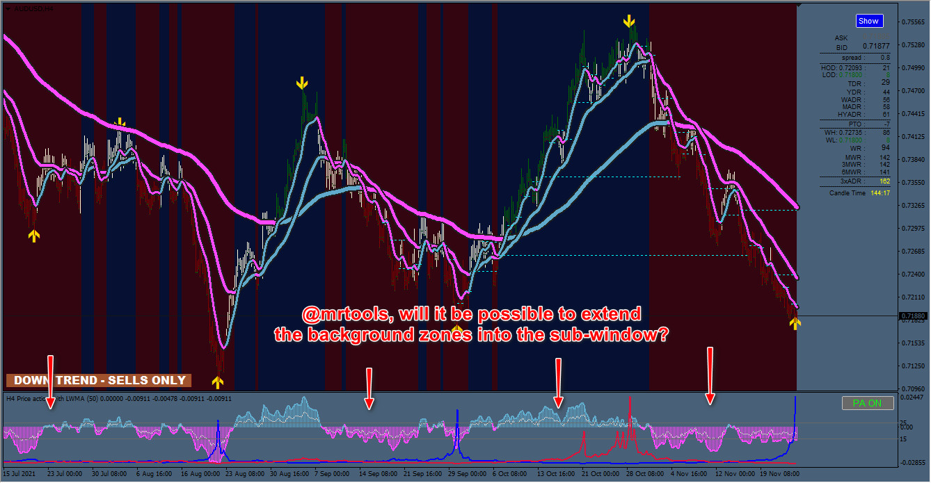 Love the new and updated indicator! A small request :-). Would it be possible to extend the background zone coloring into the sub-window? Also the ability to change the colors used in the background zones