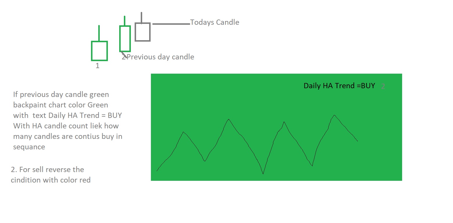 SO if input tf was daily and previous day hekin ashi candle is green paint the back ground for current day green with text HA TREND = BUY with candle count and this background color remain same for current day.