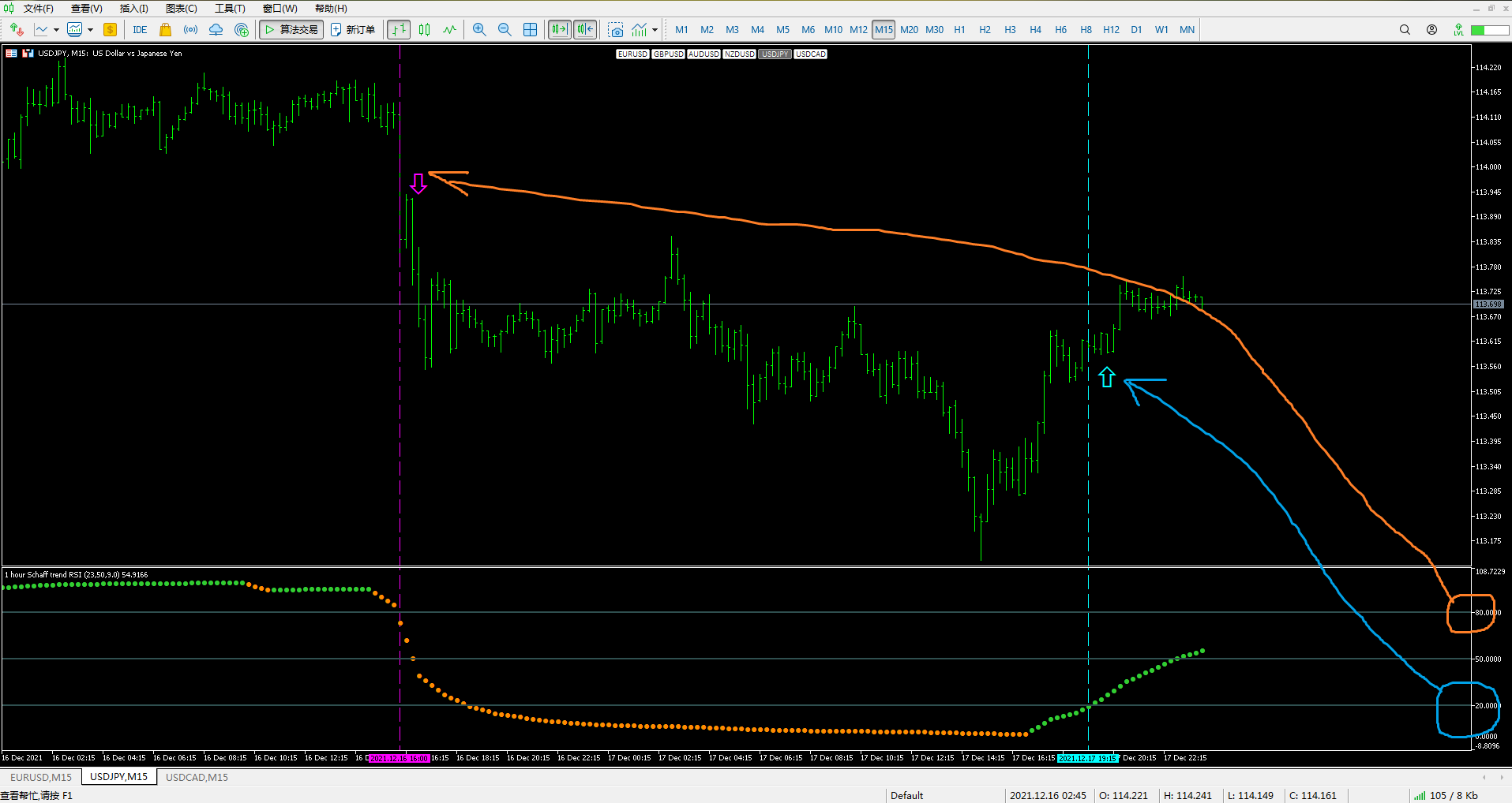 When the signal line crosses the 80 line downwards, draw a downward arrow on the main chart;