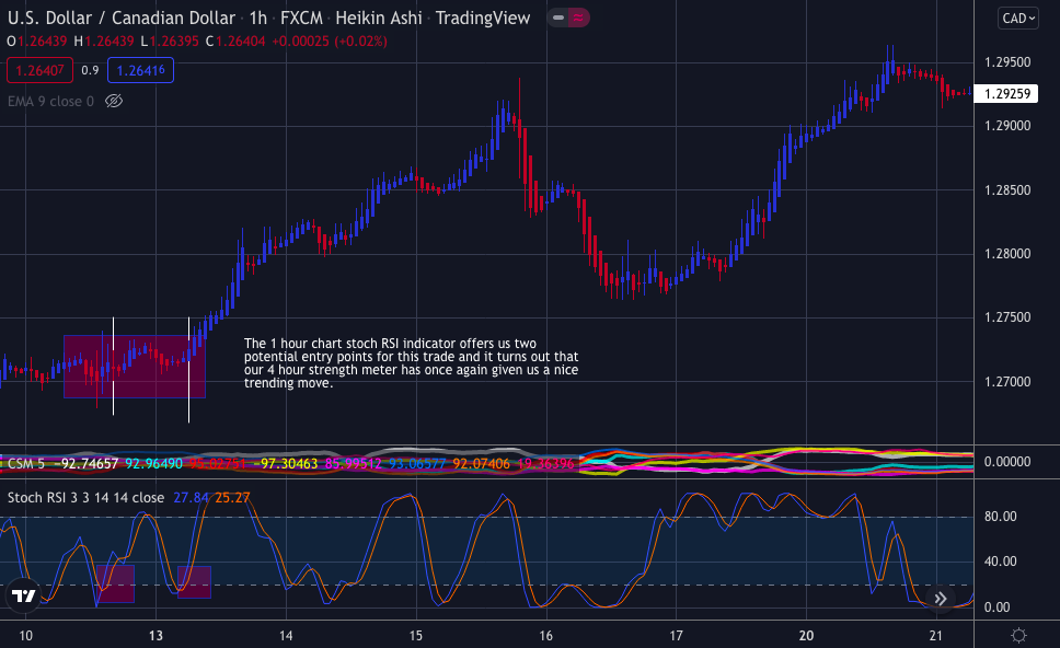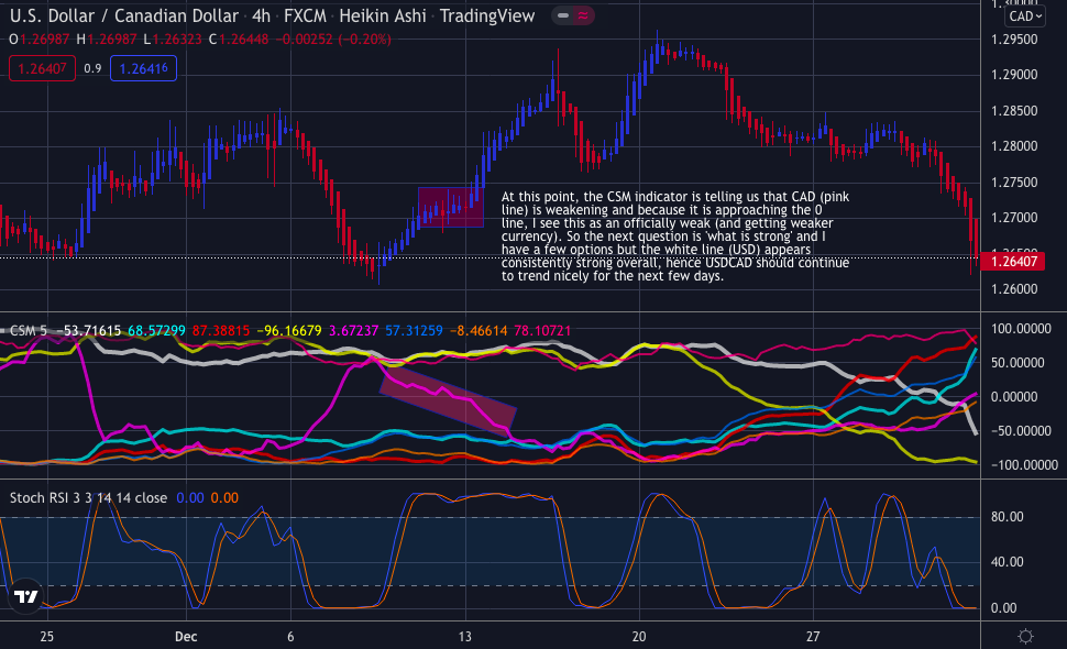 So basically, the general idea here is to use the currency strength meter indicator on a 4 hour timeframe to help me identify pairs that are likely to trend nicely over the coming 24 - 48 - 72 hours (or more) .... I like to only spend very little time actually trading and looking for set ups because I have a busy life so after 20 minutes in the morning of strength weakness analysis + some basic technical analysis on curency pair charts, I am basically able to identify any potential set ups for the day. Then, I can open up a lower timeframe chart (e.g. 1 hour) on the pairs that I am interested in and just wait for a good counter-trend move to give me my entry point.